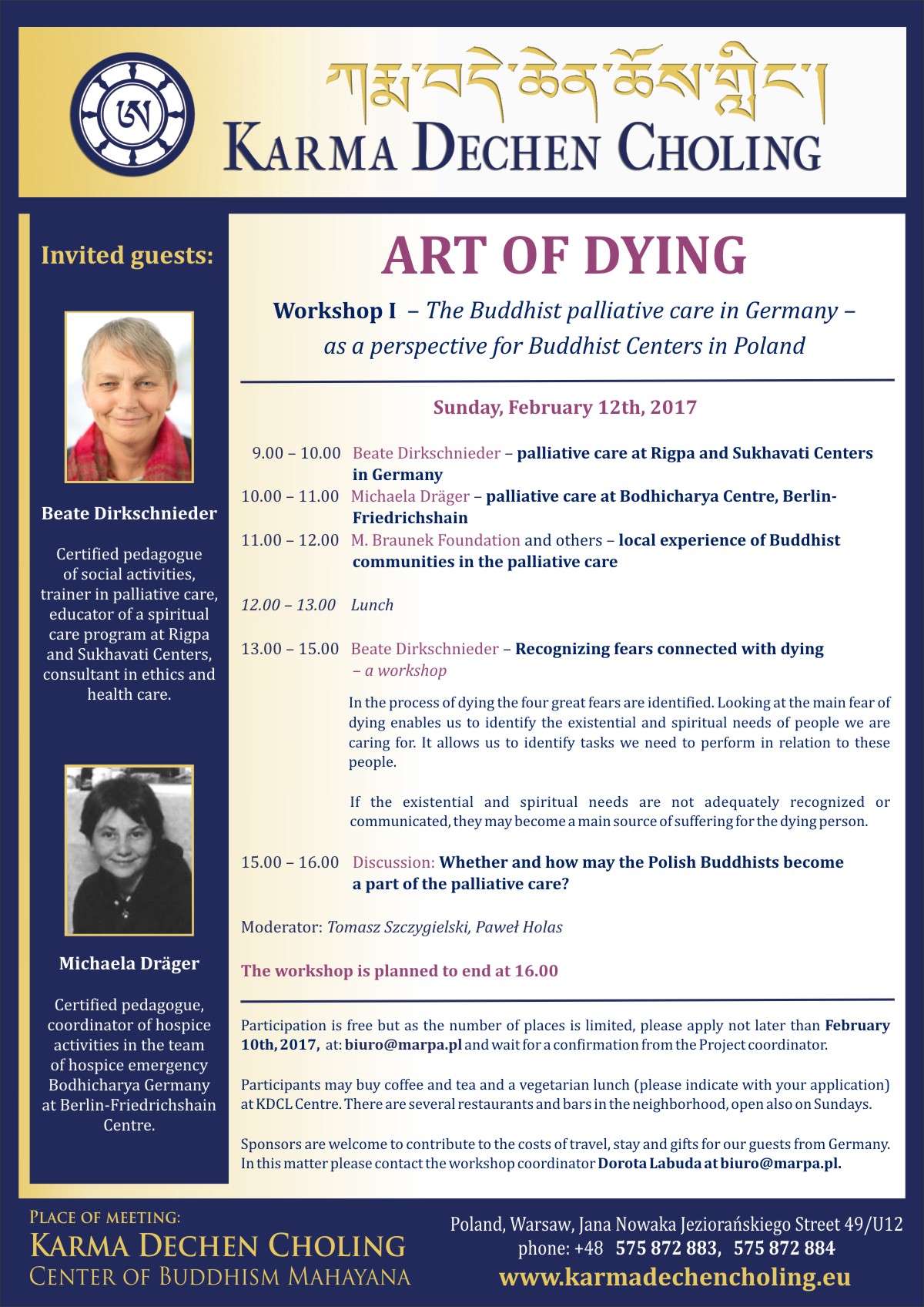 Warsztat "Sztuka umierania" poświęcony buddyjskiej opiece paliatywnej w Niemczech - jako perspektywa dla ośrodków buddyjskich w Polsce odbędzie się już w najbliższą niedzielę, 12 lutego w ośrodku Karma Dechen Choling w Warszawie.